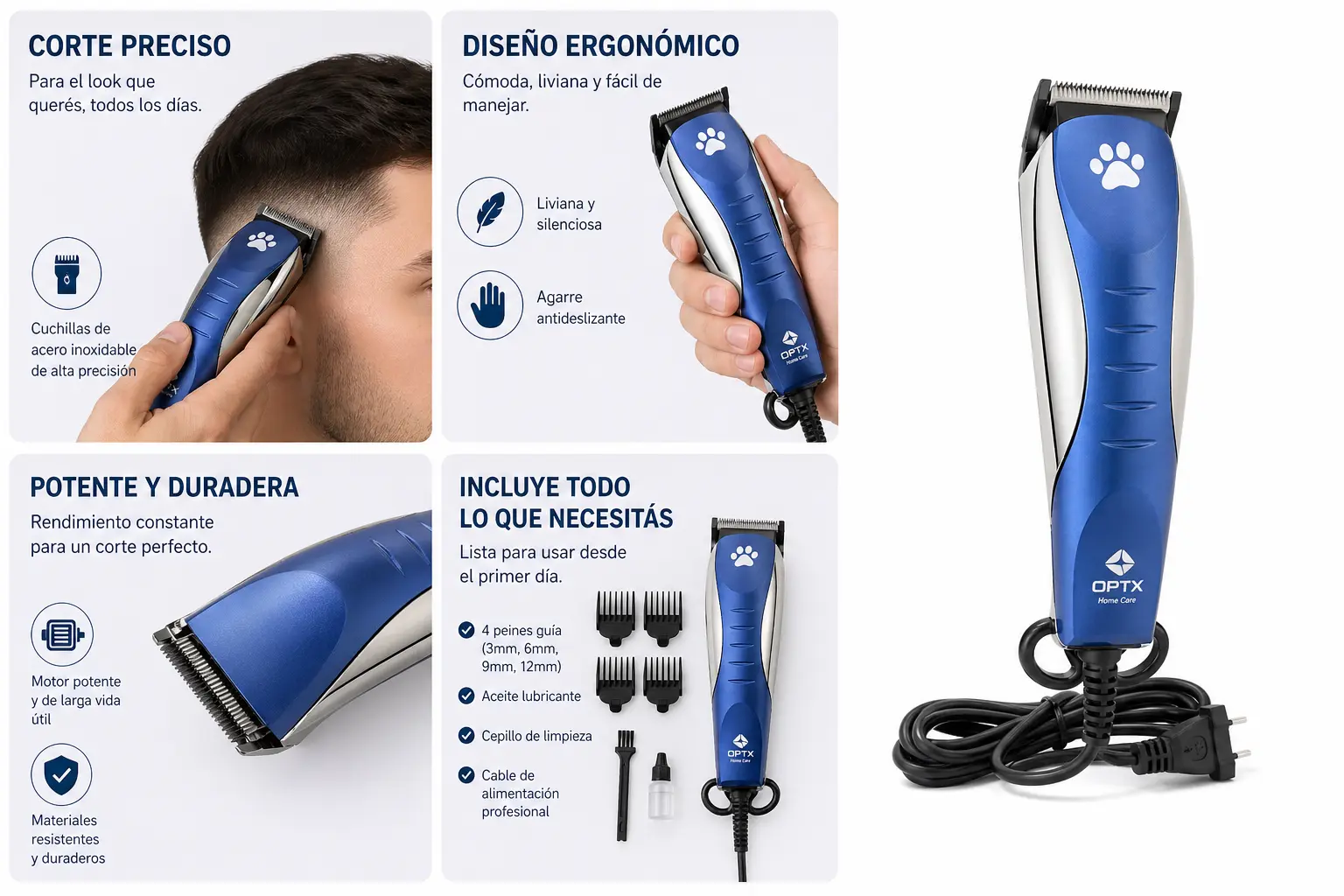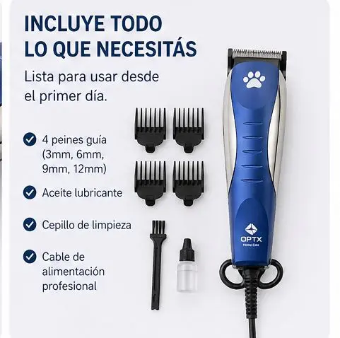 Incluye cortadora eléctrica, tijeras, peine, aceite lubricante, cepillo de limpieza, corta uñas, lima y 4 niveles de corte.